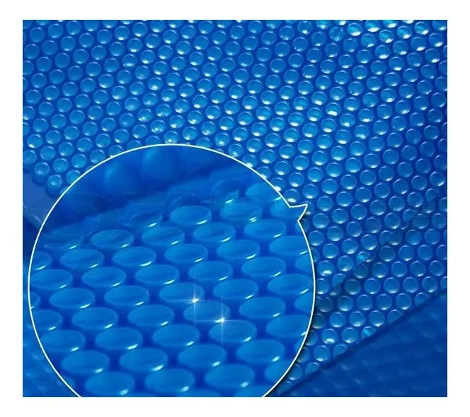 El cobertor está compuesto por una película de burbuja plástica de polietileno de baja densidad, que actúa como un aislante térmico natural. Gracias a su diseño, permite elevar la temperatura del agua entre 4°C a 6°C, aprovechando la energía solar durante el día y conservando el calor durante la noche.